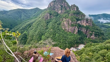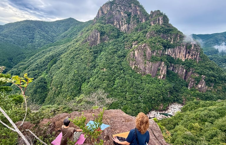 Begin with sunrise meditation and a slow exploration of Taketa’s cultural and geological gems — waterfalls, Geopark sites, and old-world charm. In the afternoon, descend into the sacred realm of Takachiho. Stand among towering cedars, walk to the mythic cave where the Shinto gods once gathered, and feel the deep pulse of Japan’s origin story. Then travel to the pristine Shishigawa region. Pause at a awe inspiring mountaintop lookout for sunset meditation before arriving at your riverside retreat nestled beneath majestic peaks.