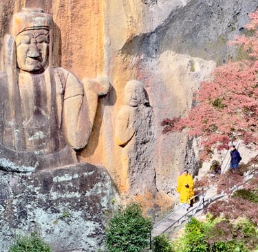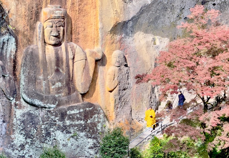 Feel time slow as you walk the grounds of Fukoji Temple, its towering stone Buddha carved into a cliff face, a sculptured garden and profound stillness.